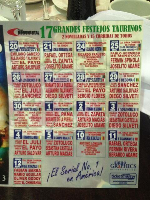 Martes, 30 de abril: Oreja de Oro. Toros de Suárez del Real para César Delgadillo, Juan Luis Silis, Jorge Delijorge, El Chihuahua, Gerardo Adame, Luis Conrado.